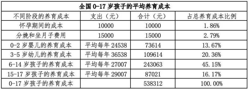 據(jù)《中國生育成本報(bào)告2024版》統(tǒng)計(jì),全國家庭0-17歲孩子的養(yǎng)育成本平均為53.8萬元,而0歲至大學(xué)本科畢業(yè)的養(yǎng)育成本平均為約68萬元。