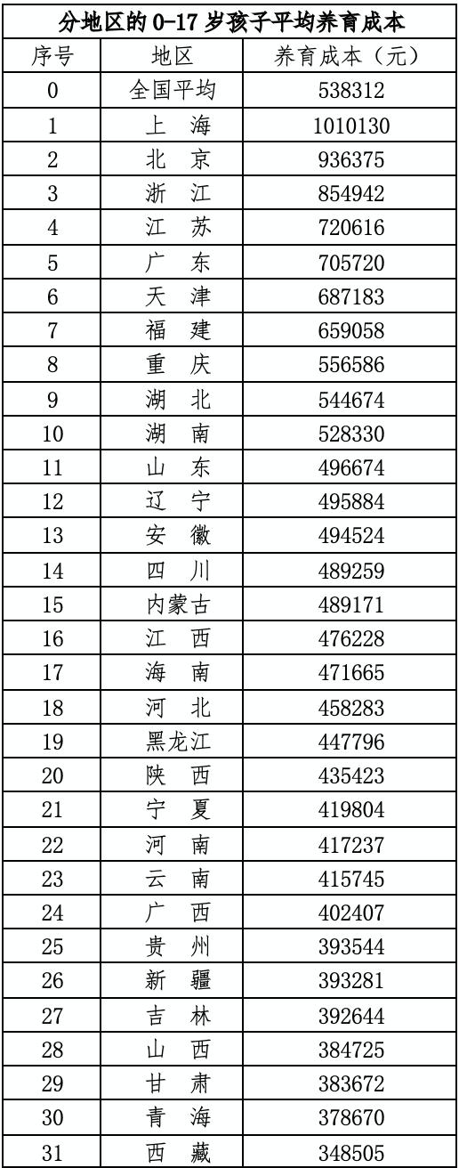 按地區(qū)來看,在上海和北京養(yǎng)娃,養(yǎng)育成本甚至分別高達(dá)101萬元、93.6萬元!