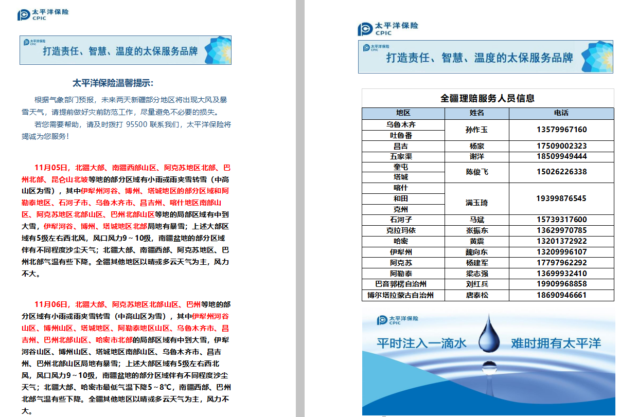 未來(lái)兩天新疆部分地區(qū)將出現(xiàn)大風(fēng)及暴雪預(yù)警,請(qǐng)注意防范。如需幫助,請(qǐng)致電95500全國(guó)客服電話或直接撥打全疆理賠服務(wù)電話 ? 太平洋保險(xiǎn)在您身邊!