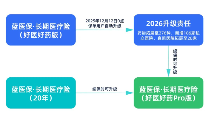 A1:藍醫(yī)?!らL期醫(yī)療險(20年)暫時不支持升級為藍醫(yī)?!らL期醫(yī)療險(好醫(yī)好藥版),藍醫(yī)?!らL期醫(yī)療險(好醫(yī)好藥版)從12月12日0點起,太平洋健康險官方平臺、太平洋保險官網(wǎng)&APP、三方渠道/平臺投保的保單用戶無需任何操作,都已免費自動升級為2026新責任,升級后才能按照新責任來理賠。