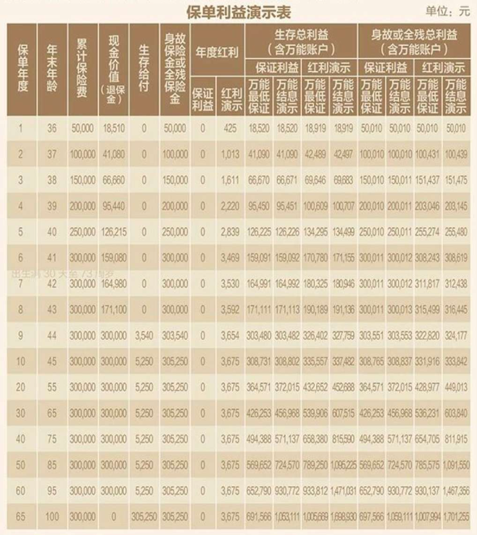 注:1.紅利分配分別按保證利益、紅利演示2種情況進(jìn)行預(yù)測(cè),僅作為參考之用。紅利演示不作為未來(lái)紅利分配的保證,實(shí)際紅利水平可能高于或低于表中所列數(shù)字;2.為了便于說(shuō)明,假定合同生效日為1月1日;3.累積紅利的累積利率為1.75%,是假設(shè)值,公司每年公布的累積利率可能高于或低于該利率;4.以上演示的被保險(xiǎn)人年齡、生存給付(包含祝福金、滿期金)為保單年度末且經(jīng)過(guò)完整保單年度的值;5.現(xiàn)金價(jià)值(退保金)、身故保險(xiǎn)金為保單年度末且經(jīng)過(guò)品整保單年度的值,保單年度中的現(xiàn)金價(jià)值(退保金)、身故保險(xiǎn)金可能高于或低于該數(shù)值,現(xiàn)金價(jià)值(退保金)不包含當(dāng)年給付的祝福金及滿明保險(xiǎn)金;6.萬(wàn)能賬戶價(jià)值按照假設(shè)的結(jié)算利率計(jì)算,最低保證、結(jié)息演示兩檔的結(jié)算利率假設(shè)分別為1.0%(最低保證利率)、3.0%,萬(wàn)能臉的最低保證利率之上的投資收益是不確定的,實(shí)際保單賬戶利益可能低于萬(wàn)能結(jié)息利益演示水平;7.合同生效日對(duì)應(yīng)日派發(fā)的相關(guān)利益計(jì)入上一保單年度末;8.演示數(shù)據(jù)保留整數(shù)。