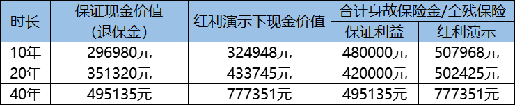 王先生保單利益包括身故保險(xiǎn)金或全殘保險(xiǎn)金,以及紅利。其演示利益如下: